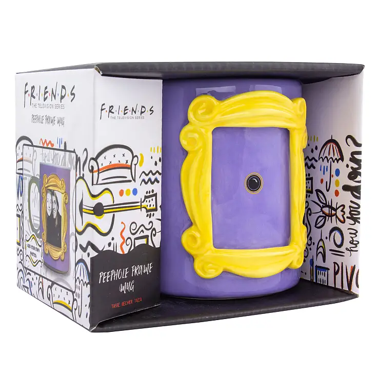 - A caneca Friends é embalada numa caixa de cartão ilustrada com janela.